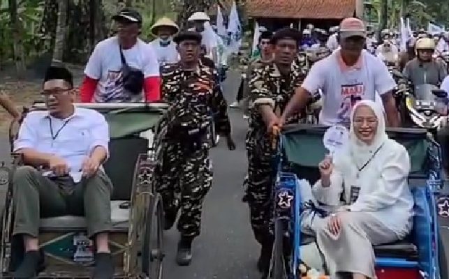 Pasangan Bakal Calon Bupati dan Wakil Bupati Amalia Desiana – Wahid Jumali (MAJU) ini berangkat menuju KPU Kabupaten Banjarnegara dengan mengendarai becak dan iringan lebih dari 100 becak, pada Rabu, 28 Agustus 2024.
