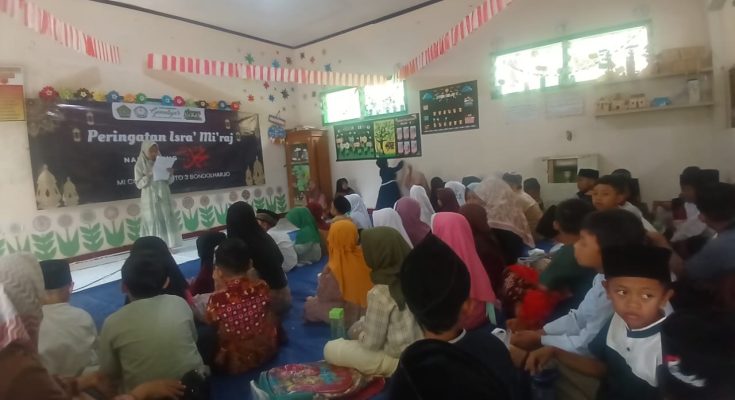 Peringatan Isra Mi’raj berlangsung di Aula ruang kelas MI Cokroaminoto 03 Bondolharjo dengan ketua panitia Intan.