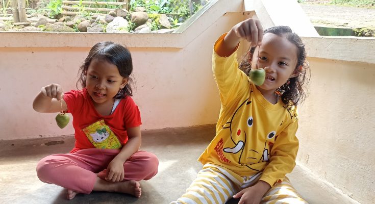 Adalah Adifa Ashalina beserta adik sepupunya Delisha Sauqina yang tengah seru memutar kelapa muda dengan diikat karet.