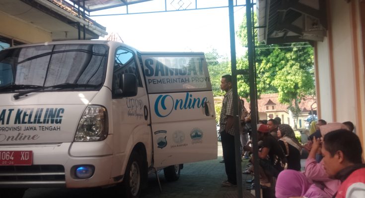 Pagi ini, Jum’at (14/6/2024) sejumlah masyarakat nampak antusias mengantri di layanan Samsat keliling yang berada di kantor Camat Wanadadi Banjarnegara.